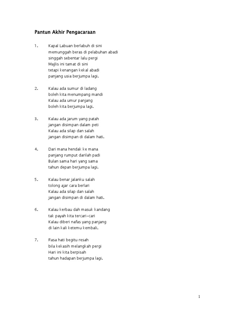Anak didik harusnya dirisau Gusar esok engkau yang dipisau. Bila lagi nak borak2. Berikut ialah contoh pantun penutup acara reuni.